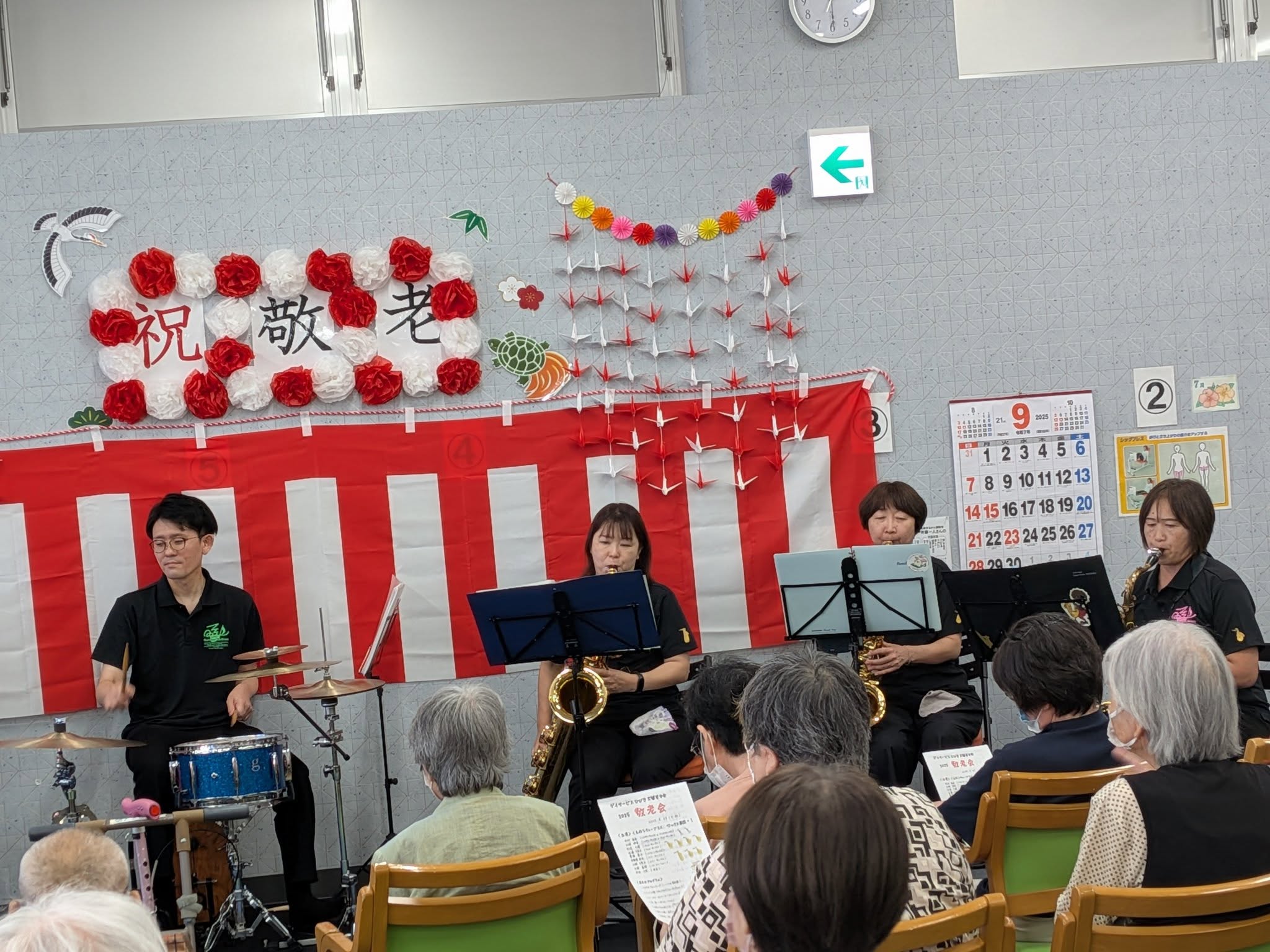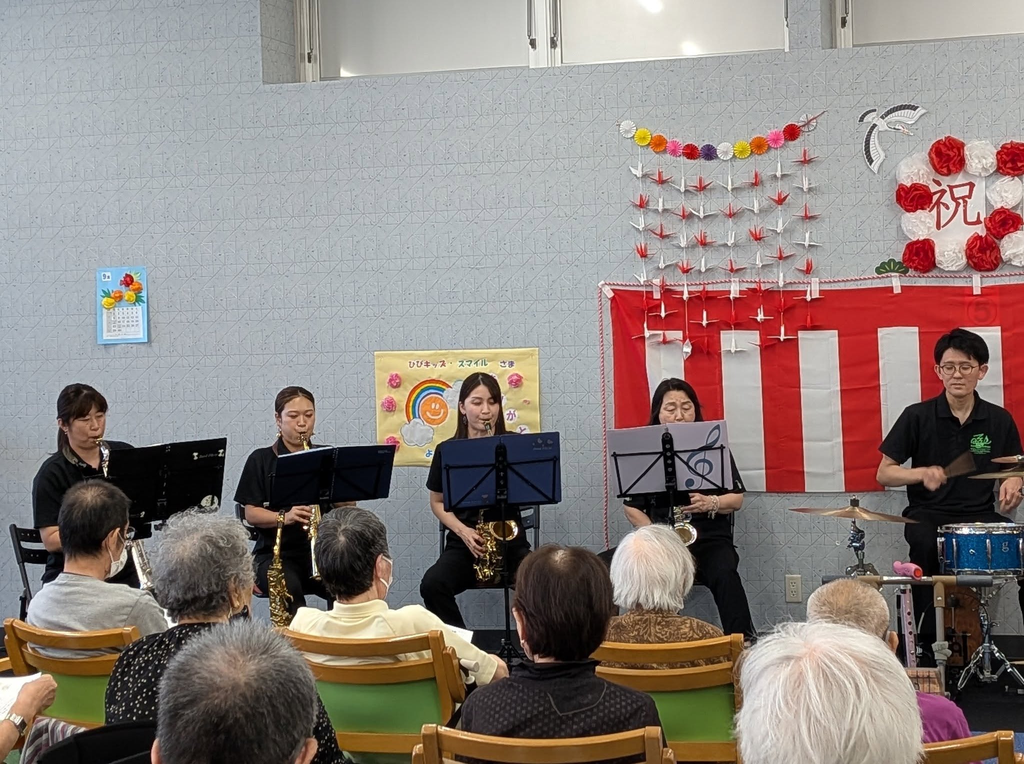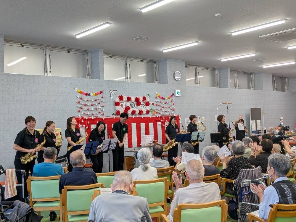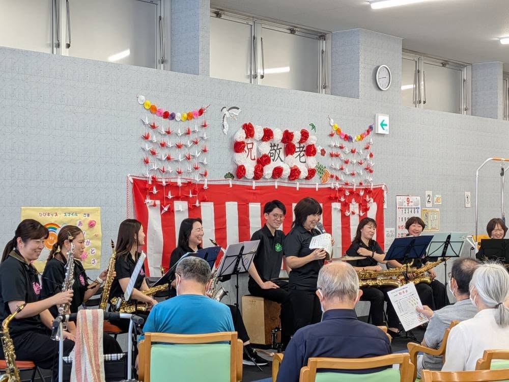 昨年に引き続き今年も、デイサービスでの敬老会の依頼演奏を受けて、Sax軍団+Per 1に出演してもらいました。楽しい会にしようと、全団の練習と別に練習日を設けたりして対応。